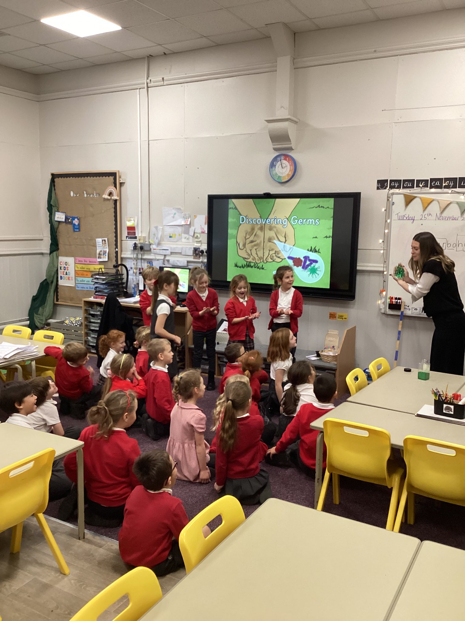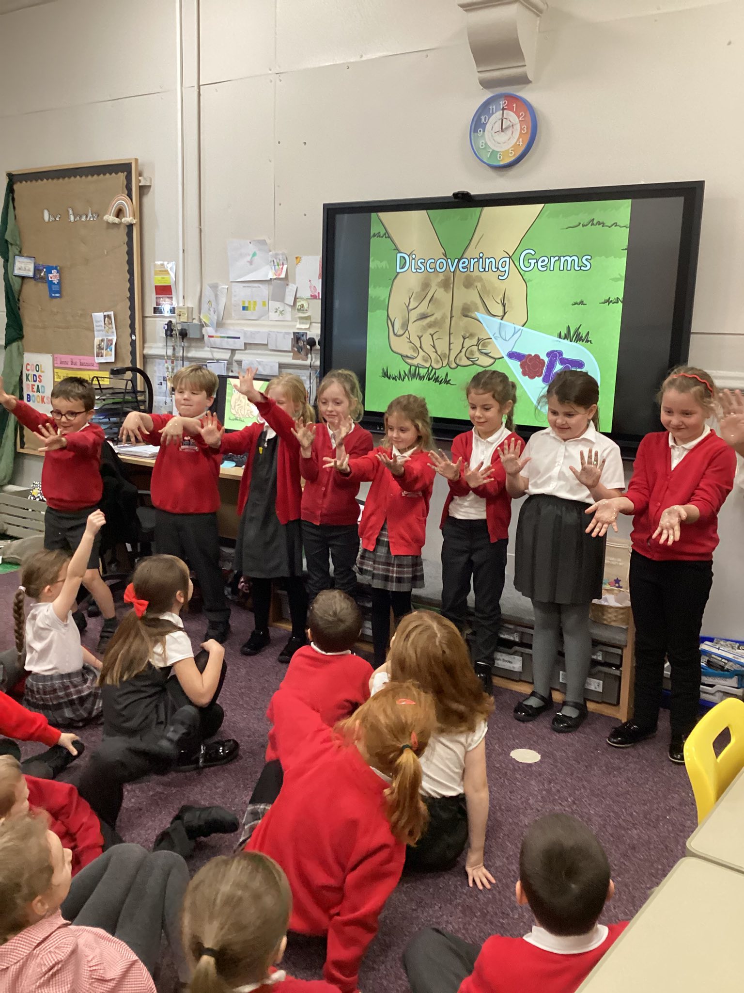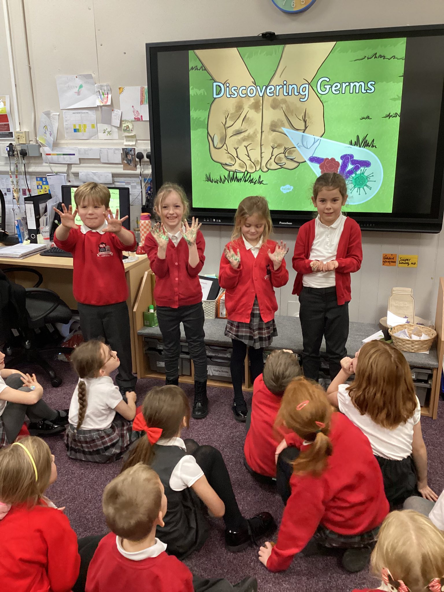 In science year 2 have discussed how germs are spread easily and the affect they have they have on our bodies. We also talked about how our bodies fight germs off to stay healthy. We used glitter to represent germs so we could see how easily germs spread. 🦠🫧 #year2 #science