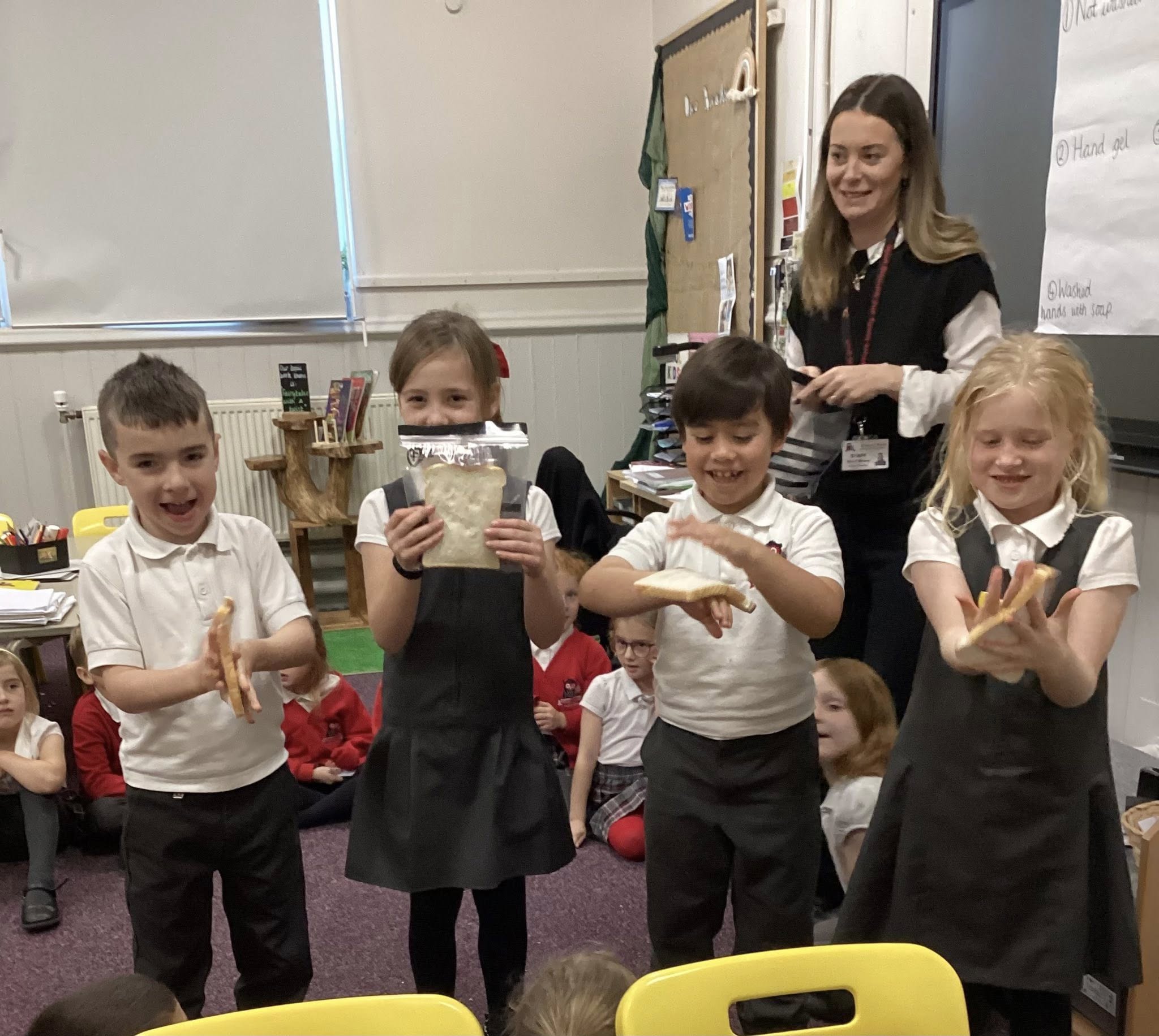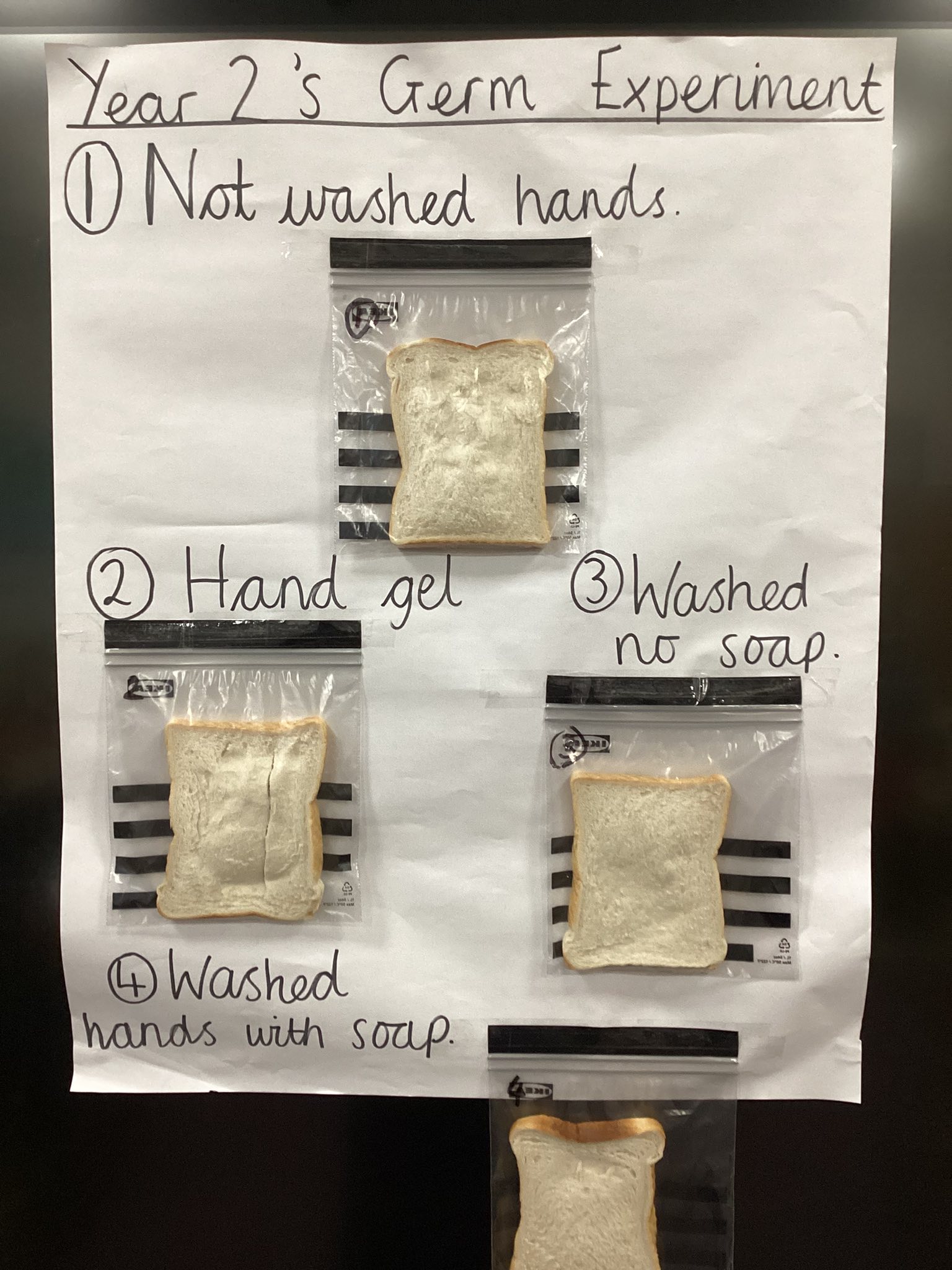 Year 2 have completed an experiment using bread to show the impact of washing hands. We wrote a prediction and talked about which method was most affective. We will observe the bread overtime to see which bread has the most germs on #science #experiment #year2